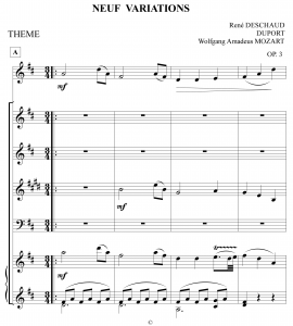 Transcription de la variation 1 des 9 variations écrites pour piano par Duport sur un thème de Mozart. Pour quatuor, piano et soliste.