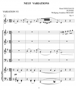 Transcription de la variation 6 des 9 variations écrites pour piano par Duport sur un thème de Mozart. Pour quatuor, piano et soliste.
